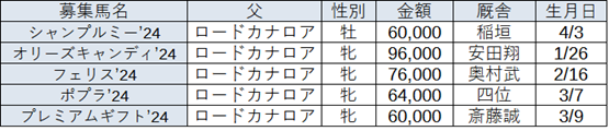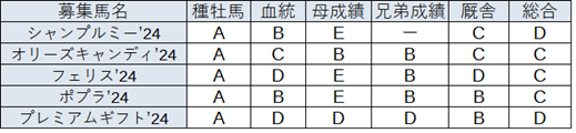 まずは本記事で評価を行う5頭の募集馬の概要と評価一覧を記載します。