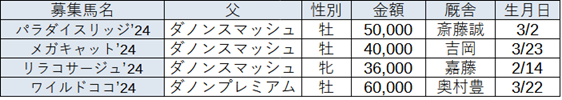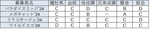まずは本記事で評価を行う4頭の募集馬の概要と評価一覧を記載します。