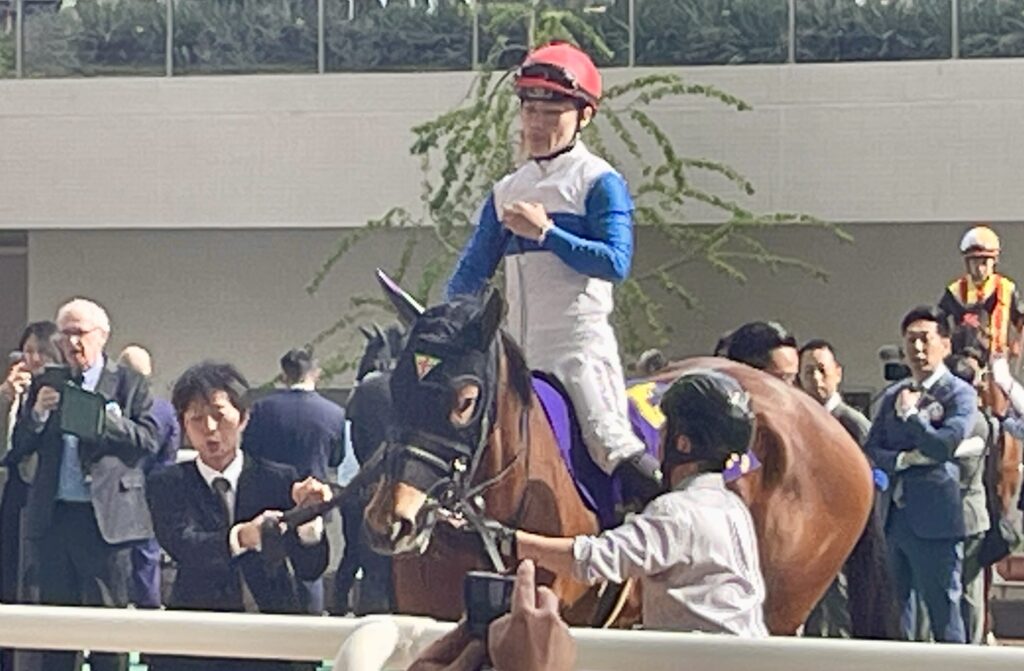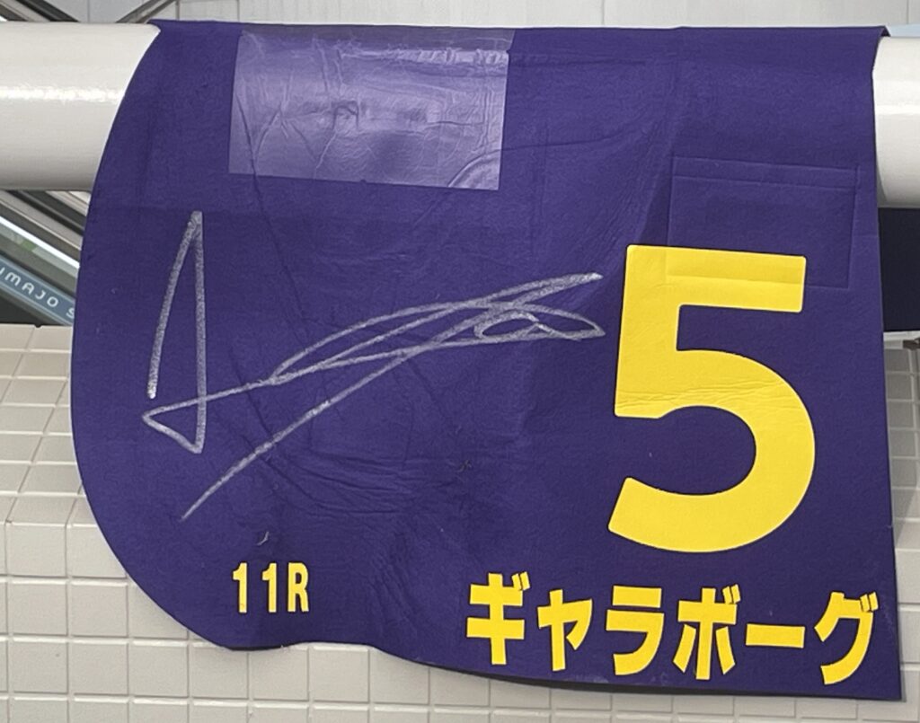 下記はレース後のゼッケン撮影。基本的には勝利時のみジョッキーのサインが書かれている印象ですが今回はサイン入りでした。