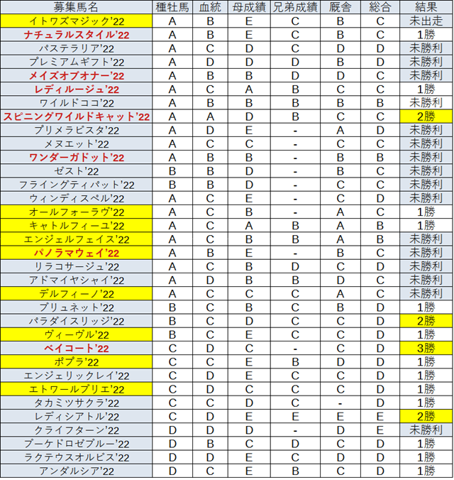 募集馬評価の記載時にはB~Eで評価していましたが、内訳は下記となりました。